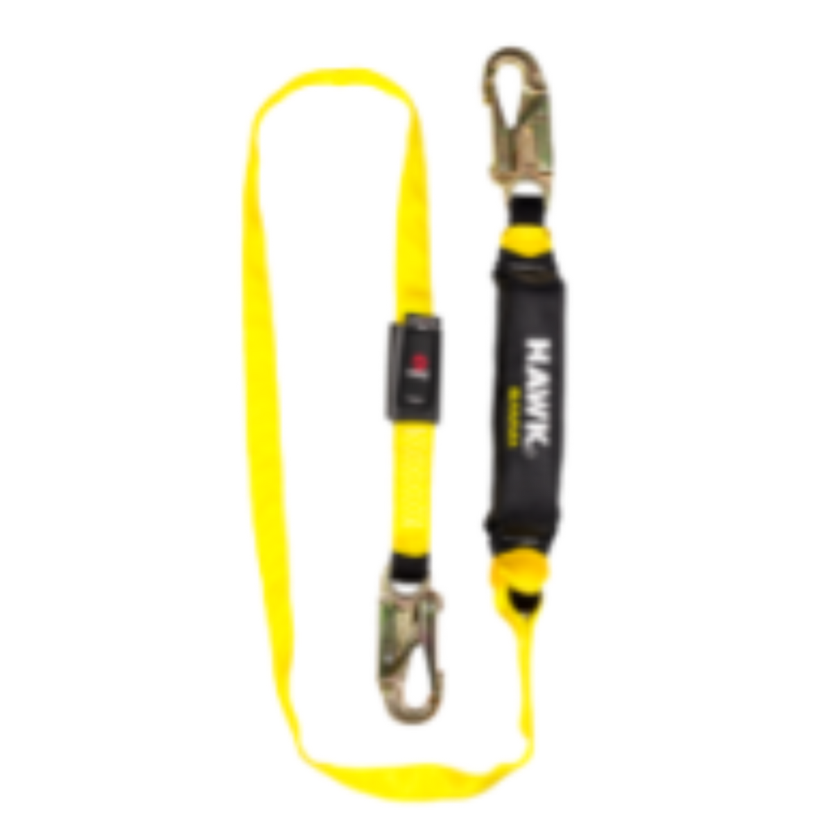 Línea o cuerda flexible que sirve para asegurar el arnés a un punto de anclaje, construido con un amortiguador de impacto externo, cuenta con dos ganchos chicos.